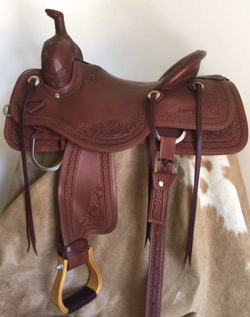 New 15.5" Diamond K Saddlery Smooth Ranch Cutter $1350 Dark oil, smooth leather/ basket stamp border/floral corners, 7" gullet, QH bars, 3.5" cantle, 3.5" horn w/ 2" cap, close contact skirts, full double rigging, six strings w/ upgraded conchos, 2" Amish wood stirrups, shop built in the USA on a Rawhide covered Hardwood tree with a 5 year warranty.