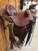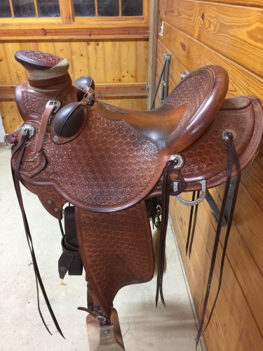 15.5" seat, 21" fenders, 4X90 tree, Watt hardware, buck rolls, includes matching breast collar, spur straps, and daisy stamped Frecker’s saddle bag. Made by Tyler Frecker.