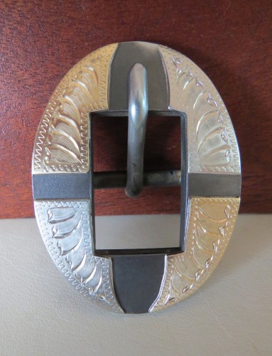 This is one new handmade ¾” headstall buckle made by long time bit and spur maker Don Rogers of Hereford, Texas. Don has been building since 1975 and his work is sought after by cowboys and collectors alike. Don is listed in Bits and Spurs, Motifs, Techniques and Modern Makers by Ned and Jody Martin. The back of the buckle is marked Rogers. The buckle is steel with a dark gray finish and is mounted with engraved brass and nickel silver.
