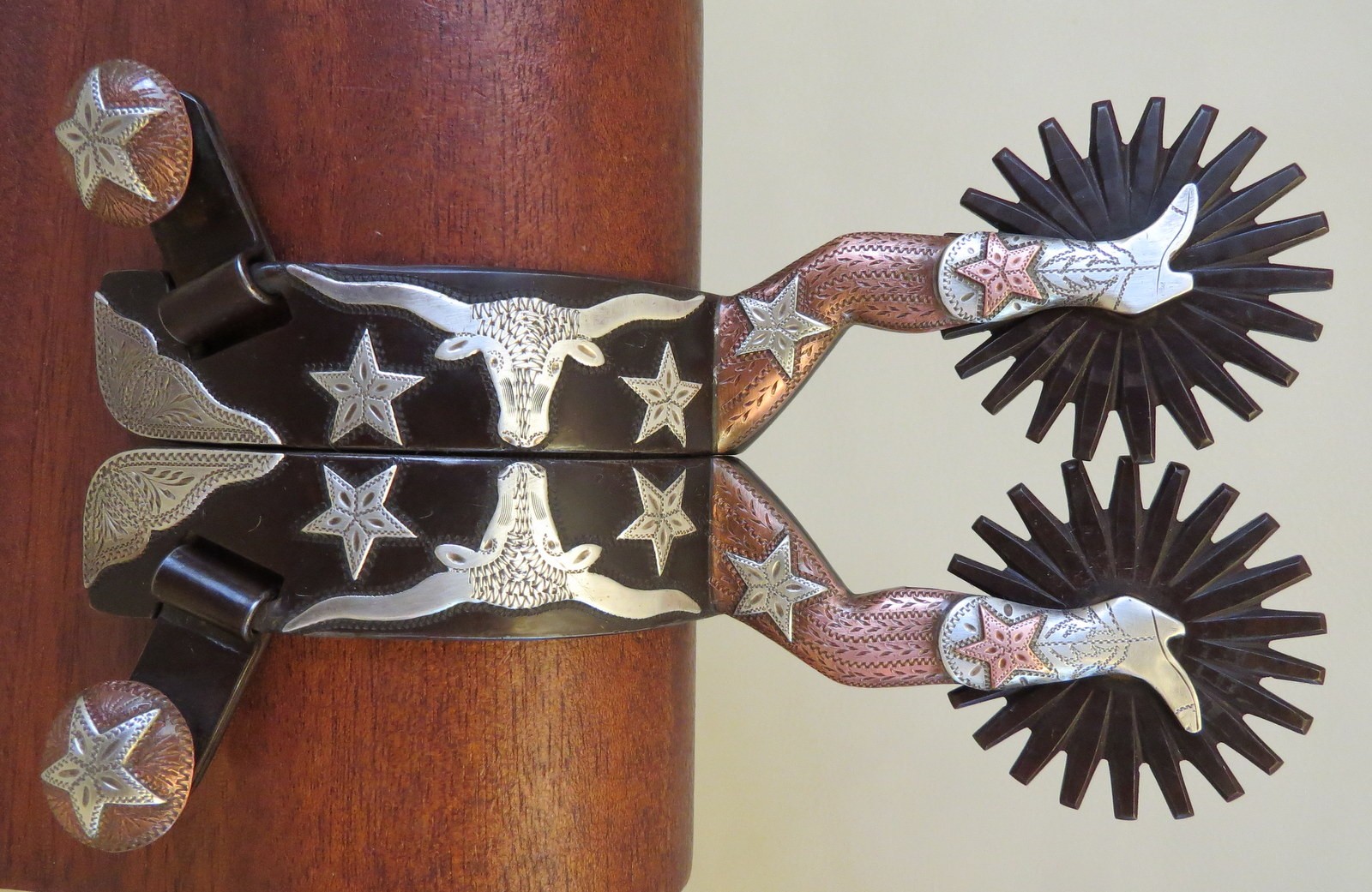 This is a pair of single mounted handmade gal leg spurs in unworn condition mounted with fourteen pieces of sterling silver and six pieces of copper. They were made by well-known and collectible bit and spur maker Randy Butters from Homer, Michigan. Randy is listed in Bits & Spurs Motifs, Techniques and Modern Makers by Ned and Jody Martin. Randy’s work is exhibited in the Cowboy Hall of Fame and museums across the United States. He was the Academy of Western Artists’ 2005 National Spur Maker of the Year award. He was the 2016 10th Annual Adolph Bayers Spur Maker of the Year Award recipient. The spurs are marked with his maker mark and numbered 876. The spurs are steel with a brown finish with engraving in the steel around the mountings. There are some minor marks from handling. This would be a nice pair of spurs to wear or to add to a collection.