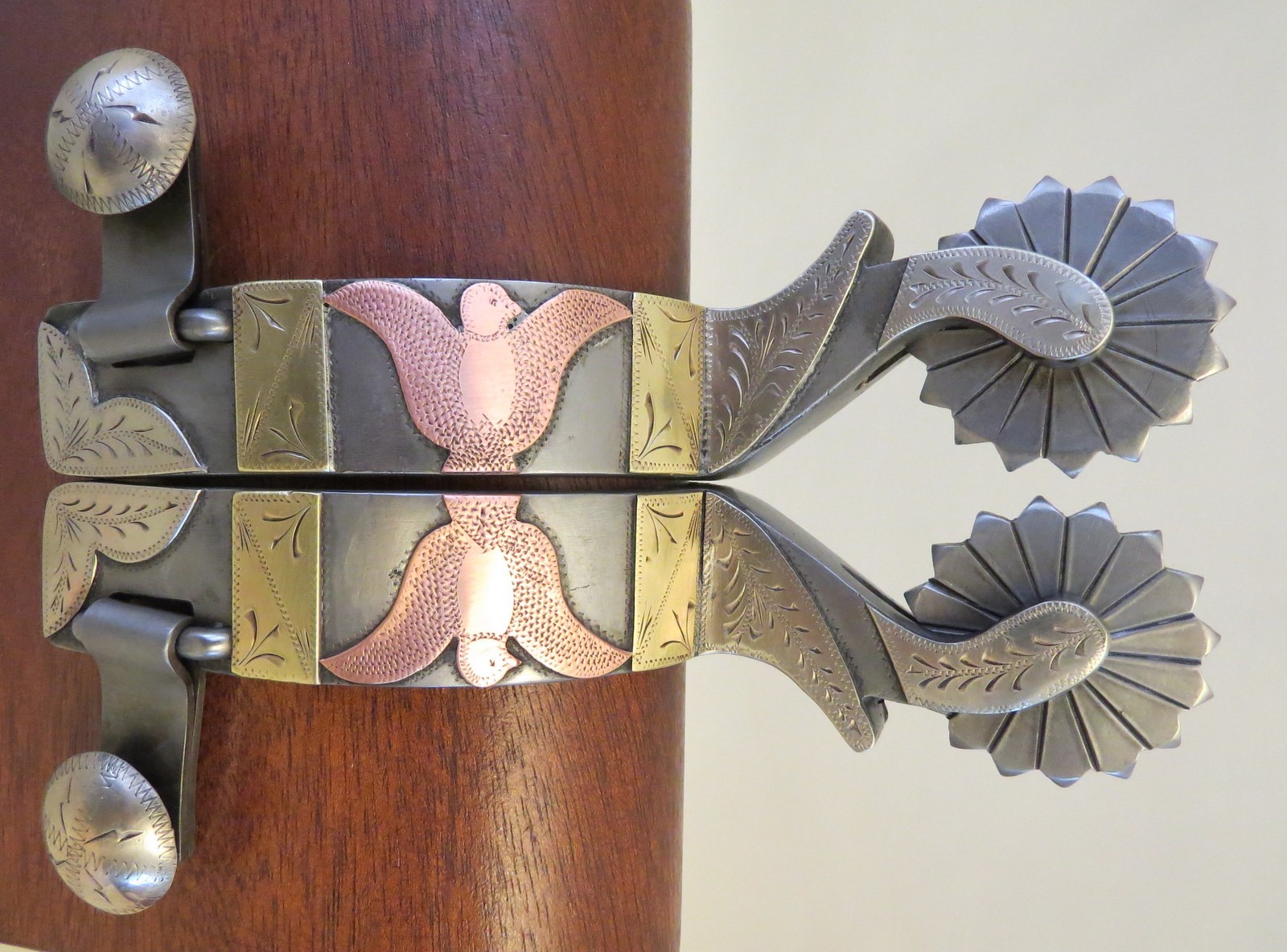 Measurements: Heel Band Width ⅞”, Shanks a little less than 2”, Rowel Diameter 1 ½”, Rowel Points 16, Heel Opening 3 ¼”, Weight of Both Spurs 1lb 6.4oz
