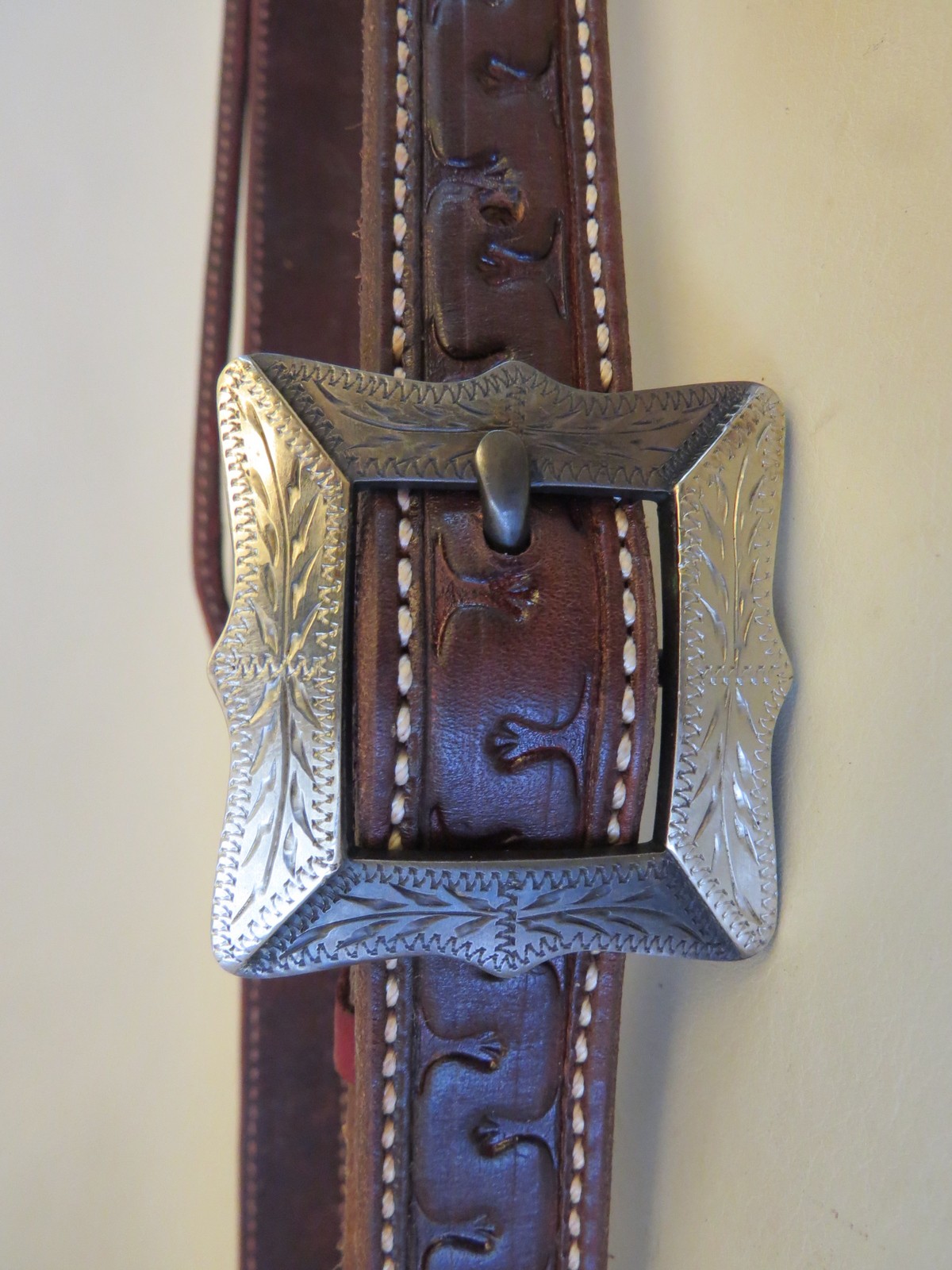 This is a new handmade split ear 1” headstall with a handmade buckle. The headstall is made out of dark oiled skirting leather with beveled and hand rubbed edges. It is lined with latigo leather and stitched around the outside edges. The bit ends are tapered to ¾” and the bit attaches with latigo tie strings. It was made by Jeremiah Miller from Lubbock, Texas. He is a cowboy and horseman and knows how to build gear that works. It is maker marked with his stamp. The buckle was made by bit and spur maker David Hunt from Panhandle, Texas and is marked with his stamp. It is steel mounted with engraved nickel silver. The buckle is attached to the headstall with latigo lace leather.