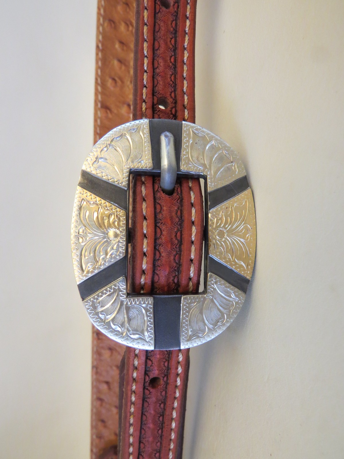 This is a new handmade tooled slide ear ¾” headstall with a handmade buckle. The headstall is made out of skirting leather with beveled and hand rubbed edges. It is lined with alligator leather and stitched around the outside edges. The headstall is 1” and tapers to ¾” at the buckle strap. The bit ends are tapered to ¾” and the bit attaches with latigo tie strings. It was made by Jeremiah Miller from Lubbock, Texas. He is a cowboy and horseman and knows how to build gear that works. It is maker marked with his stamp. It has a new buckle made by long time bit and spur maker Don Rogers of Hereford, Texas. Don has been building since 1975 and his work is sought after by cowboys and collectors alike. Don is listed in Bits and Spurs, Motifs, Techniques and Modern Makers by Ned and Jody Martin. The back of the buckle is marked Rogers. The buckle is steel with a dark gray finish and is mounted with engraved nickel and brass. The buckle is attached to the headstall with latigo lace leather.