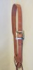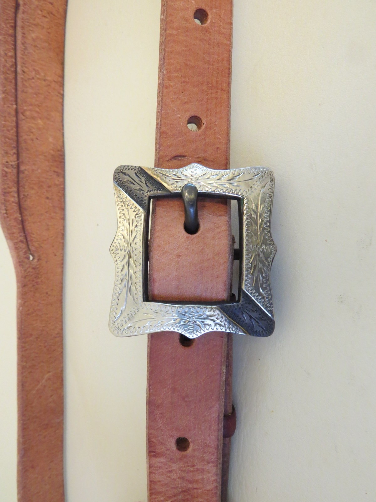 New handmade heavy harness leather shaped ear split ear 1” headstall with a handmade buckle. The headstall is made out of heavy harness leather with beveled and hand rubbed edges. The bit ends are tapered to ¾” and the bit attaches with latigo tie strings. It was made by Jeremiah Miller from Lubbock, Texas. He is a cowboy and horseman and knows how to build gear that works. It is maker marked with his stamp. The buckle was made by bit and spur maker David Hunt from Panhandle, Texas. The back of the buckle is marked with his maker mark. It is steel mounted with engraved nickel silver. The buckle is attached to the headstall with latigo lace leather.