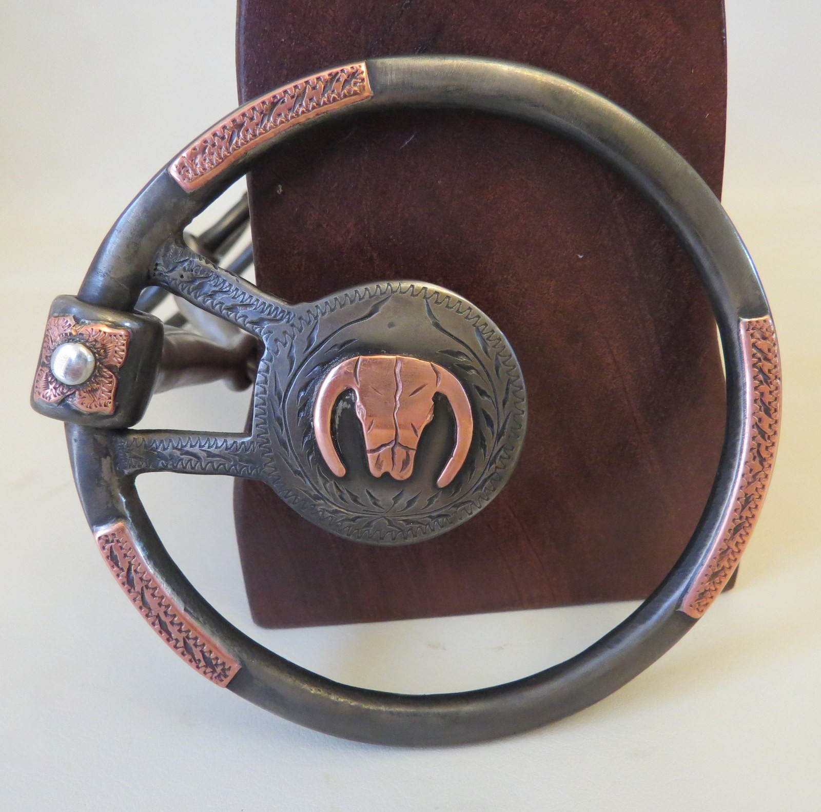 This is a new handmade bit made by David Hunt of Panhandle, Texas. It is marked Hunt and his brand a joined 7 and H and the number 251. David is a well-known bit and spur maker and has been building for over a decade. David is among the select group of spur makers to provide spurs for the Texas Style Bit and Spur Makers Association Woman’s Protective Services auction along with other top makers. The bit is steel with a dark iron finish and is mounted with engraved copper with a nickel silver dot in the center of the flowers. There is engraving in the steel between the mountings. This would be a nice bit to use.