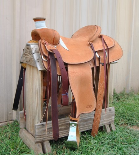 Tucson Rancher ranch saddle by SYL Leather of Stillwater, OK. Marked SYL LEATHER STILLWATER, OK, this saddle features a 15 1/2’’ seat (built on a 15 3/4’’ Tucson Rancher tree), full roughout leather is 13/15 heavy russet skirting, saddle strings, 3’’ wood post horn w/ mule hide horn wrap, stainless hardware, 7/8’’ drop plate rigging, 14 1/2’’ swells, 1’’ Cheyenne roll cantle, rounded square skirts, latigo tie straps on both sides, mohair roper girth (of your size choice), rear cinch, 3’’ SS metal bound wood stirrups, double row border stitching, double stitched stirrup leathers, and real wool lining. This saddle will fit a horse and rider very well with a 6 3/4’’ x 7 1/2’’ gullet, 3 1/2’’ cantle w/ 1 1/4 dish. Tree is wood with fiberglass cover. Price includes shipping to the lower 48 states. Located in Stillwater, OK.