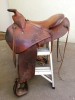 Unique Monte Foreman Balanced Ride Saddle made by Merlyn "Slim" Fallis, of Fallis Saddlery started in 1951. The Balanced Ride Saddles are unique for their "forward hung stirrups" which are designed to hang farther forward than conventional stirrups to increase the rider’s balance. This saddle belonged to my mother, who no longer rides. It is in fair condition, with some obvious wear but still usable and a nice piece of saddle history. Please email with any questions or for more photos.