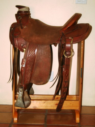 PLEASE NOTE THAT IT HAS “OLD TIMEY” EXPOSED STIRRUP LEATHERS, WITH A VERTICAL “SOUTHWEST” PATTERN STAMP. THIS PATTERN IS JUST LIGHTLY DIFFERENT THAT THE BODY OF THE SADDLE WHICH IS A BASKET WEAVE STAMPING. I THINK THIS MAKES FOR AN INTERESTING CONTRAST.