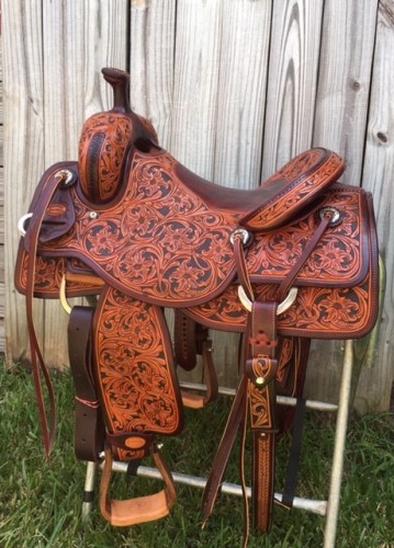 New Don Rich Ranch Cutter. 15.25 in seat. FANCY!!! Fully floral tooled with dyed background. Buster Welch tree. Lifetime warranty on tree. Top of the line!