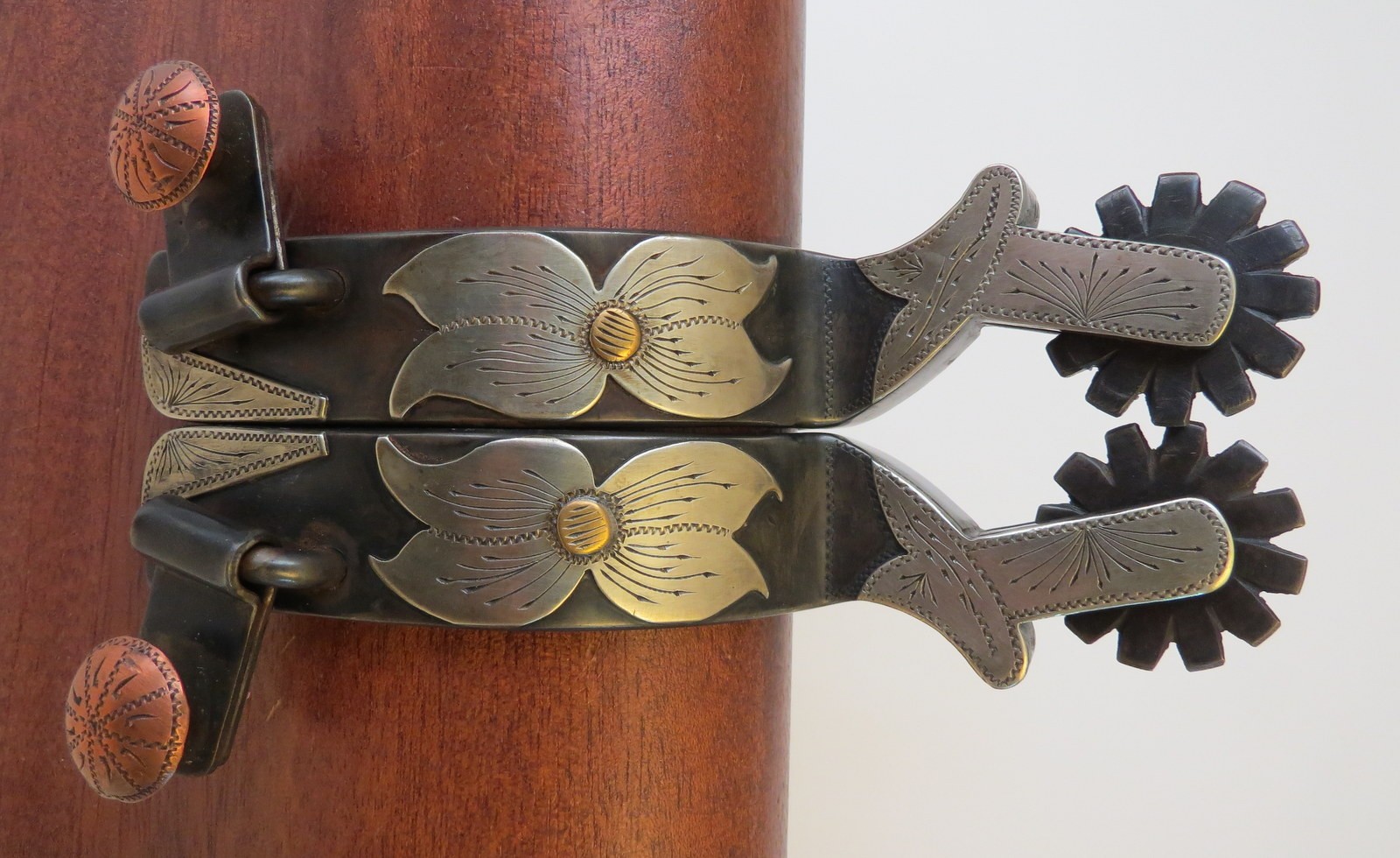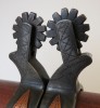 Measurements: Heel Band Width a little less than 1”, Shank 2”, Rowels 1 ¼”, Rowel Points 12, Heel Opening 3 ⅛”, Weight of Both Spurs 1lb 7.1oz