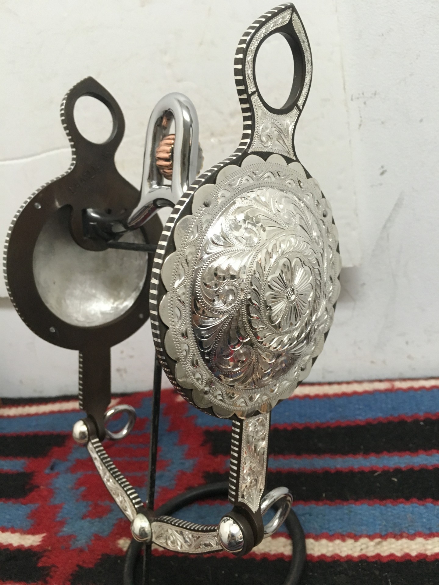 Very well done bit with 4" concho, 5" San Quentin mouth, 7 1/2" cheeks. Qaulity bit marked CHARLIE’S to add to your collection or to use. Steel is well done, smooth. Lot of inlay work and the fine engraving. This bit was made for us by long time craftsmen in Mexico.