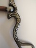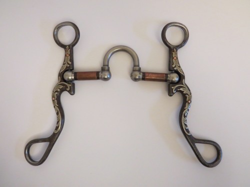 This is a used correction port bit made by well-known maker Kerry Kelley. Kerry is from Weatherford, Texas and has been building bits and spurs since 1997. The bit is marked Kerry Kelley inside one cheek piece. Kerry is listed in Bits & Spurs Motifs, Techniques and Modern Makers by Ned & Jody Martin. The bit is steel with a natural patina and is mounted with nickel silver and copper. Copper is overlaid on the mouth piece bars. It is not bent, broken, or repaired. This would be a nice bit to use.