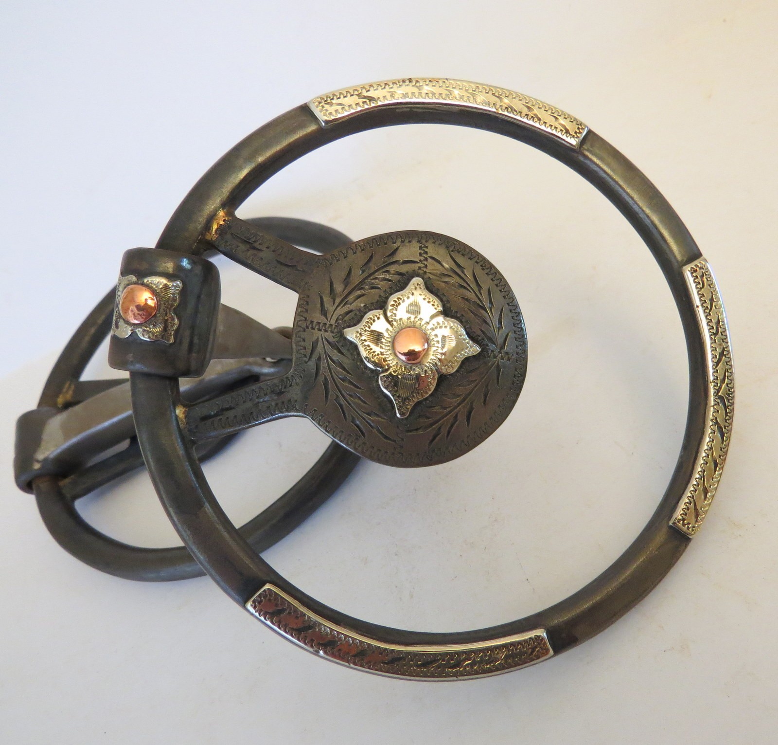 This is a new handmade bit made by David Hunt of Panhandle, Texas. It is marked Hunt and his brand a joined 7 and H and the number 259. David is a well-known bit and spur maker and has been building for over a decade. David is among the select group of spur makers to provide spurs for the Texas Style Bit and Spur Makers Association Woman’s Protective Services auction along with other top makers. The bit is steel with a dark iron finish and is mounted with engraved nickel silver with a copper dot in the center of the flowers. There is engraving in the steel between the mountings. This would be a nice bit to use.