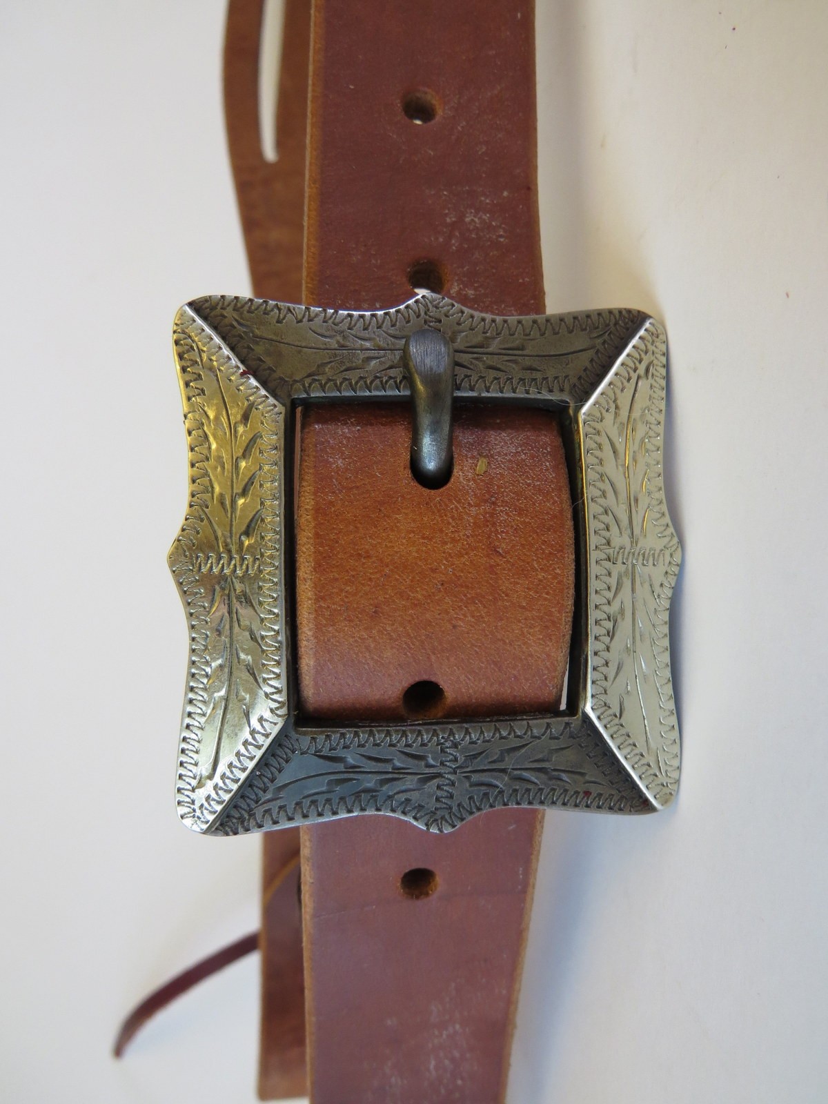 This is new handmade 1” harness leather shaped ear slot ear headstall with a new handmade marked buckle. The headstall is made from harness leather and the bit attaches with latigo tie strings. The edges are beveled and hand rubbed. It was made by a grumpy old cowboy from Happy, Texas. He has been building cowboy gear since the 1970’s. He does a really nice job. It is marked with his stamp. The buckle was made by bit and spur maker David Hunt from Panhandle, Texas and is marked with his stamp. It is steel with a dark iron finish mounted with engraved nickel silver. There is engraving in the steel between the mountings. The buckle is attached to the headstall with latigo lace leather.