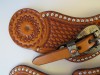 This is a new pair of handmade pass through style spur straps made by Rachel Scribner from Madill, Oklahoma. They are stamped with her maker stamp. Rachel does quality work. They are made of about ten to eleven ounce light oiled skirting leather stamped with a basket weave pattern. The strap edges are beveled, hand rubbed, and dyed. They have nickel spots around the edges. The buckles were made by David Hunt. David is a long time bit and spur maker from Panhandle, Texas. They are marked HUNT and with his brand a joined 7H. They are steel mounted with nickel silver flowers and leaves. The flowers have copper centers. The buckles are attached to the straps with chicago screws. Rachel and David do a nice job and these would be a nice pair of straps to wear or to use to display with your collectible spurs. If you plan on wearing these please check the measurements below to see if they will fit your boot.