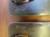 This is a pair of handmade single mounted spurs made by long time bit and spur maker Kevin Elkins from May, Texas. He is listed in Bits and Spurs, Motifs, Techniques and Modern Makers by Ned and Jody Martin. The book says he uses 1018 cold rolled steel and his customer base includes ex-Dallas Cowboy Chuck Howley and former president George W Bush. The spurs are marked Elkins and numbered 218 on the outside of the heel bands under the offside hanger. The spurs are steel with a natural patina and are mounted with twelve pieces of nickel silver. There is a wheat stalk engraved in the steel between the mountings on the outside shank. The spurs are in used condition and there is some play in the rowels but not a lot. There is wear on the mountings, engravings, and hangers but they still have a lot of use left in them. These spurs would be nice to use or a great pair of spurs to add to a collection from a very collectible maker.