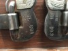 This is one nice pair of spurs by Texas maker David Hunt. They are unworn, just a little rust started, marked 7H HUNT 193. 1 3/4" rowels, 3 3/8" heel openings, 2 1/4" shanks, 1" scalloped heel bands. Good using pair and will fit many spur collections. We pay shipping within the 48 states and accept most forms of payment.