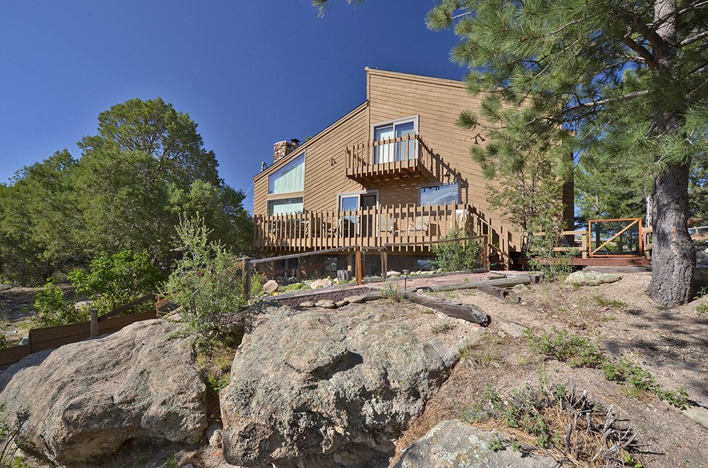 A rare offering of truly one of the most beautiful 60 acre parcels of land in Elbert County. This parcel features stunning rock formations, thousands of mature pines, year round running creek, pond and wildlife galore! The contemporary style two story, 3 bedroom, 3 bathroom, custom home features an open floor plan concept with Pella windows, huge moss rock fireplace & zone electric heating (low utility bills). The home offers hardwood floors throughout the main level, Corian countertops, handmade oak cabinetry, custom hand crafted tile flooring & Talavera tile countertops & backsplash. The master suite is located upstairs with master bath & study. The master bedroom walks out to a private deck overlooking incredible mountain and valley views. The fully finished walk out level has two bedrooms, a bathroom & a family room. Two car garage with storage loft and workshop. Directions from Elizabeth, S. on CR 17/21 to CR 106. W. on CR106 to Judge Adams Road. N. to end. Buyer to verify all information. Offered by Julie Atkinson of ReMax Accord, Elizabeth, CO. 303-638-8390. To see this home and others, go to www.homesandlandco.com