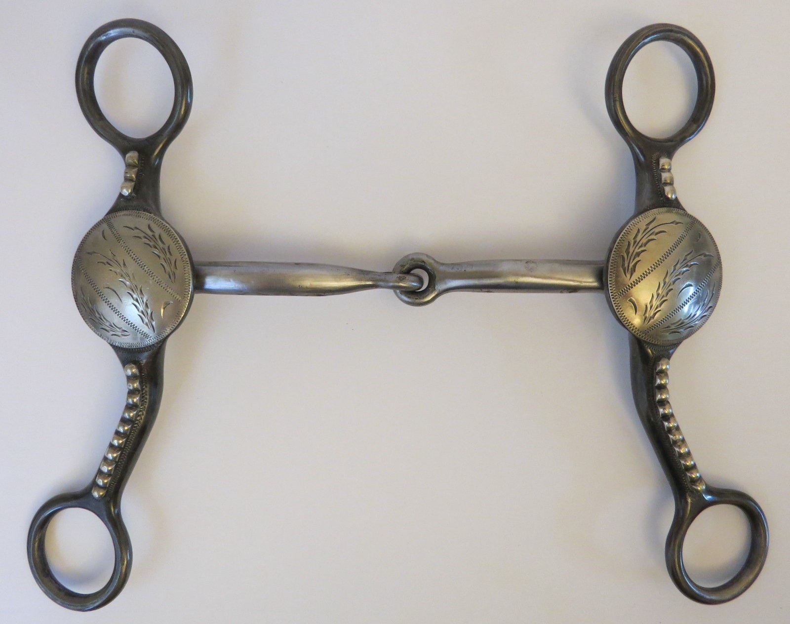 This is a new handmade snaffle bit made by Gary Wiggins from Brewster, Kansas. Gary is listed in Bits & Spurs, Motifs, Techniques and Modern Makers by Ned and Jody Martin. Inside one cheek piece is marked Wiggins and inside the other cheek piece is 101*38SN*17 inside the other cheek piece. The bit is steel with a dark iron finish and is mounted with a nickel silver concho engraved with wheat stalks. There is engraving in the steel around the nickel silver beads. There are copper inlaid stripes on the back of the bars. Gary does really nice work.