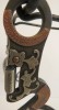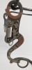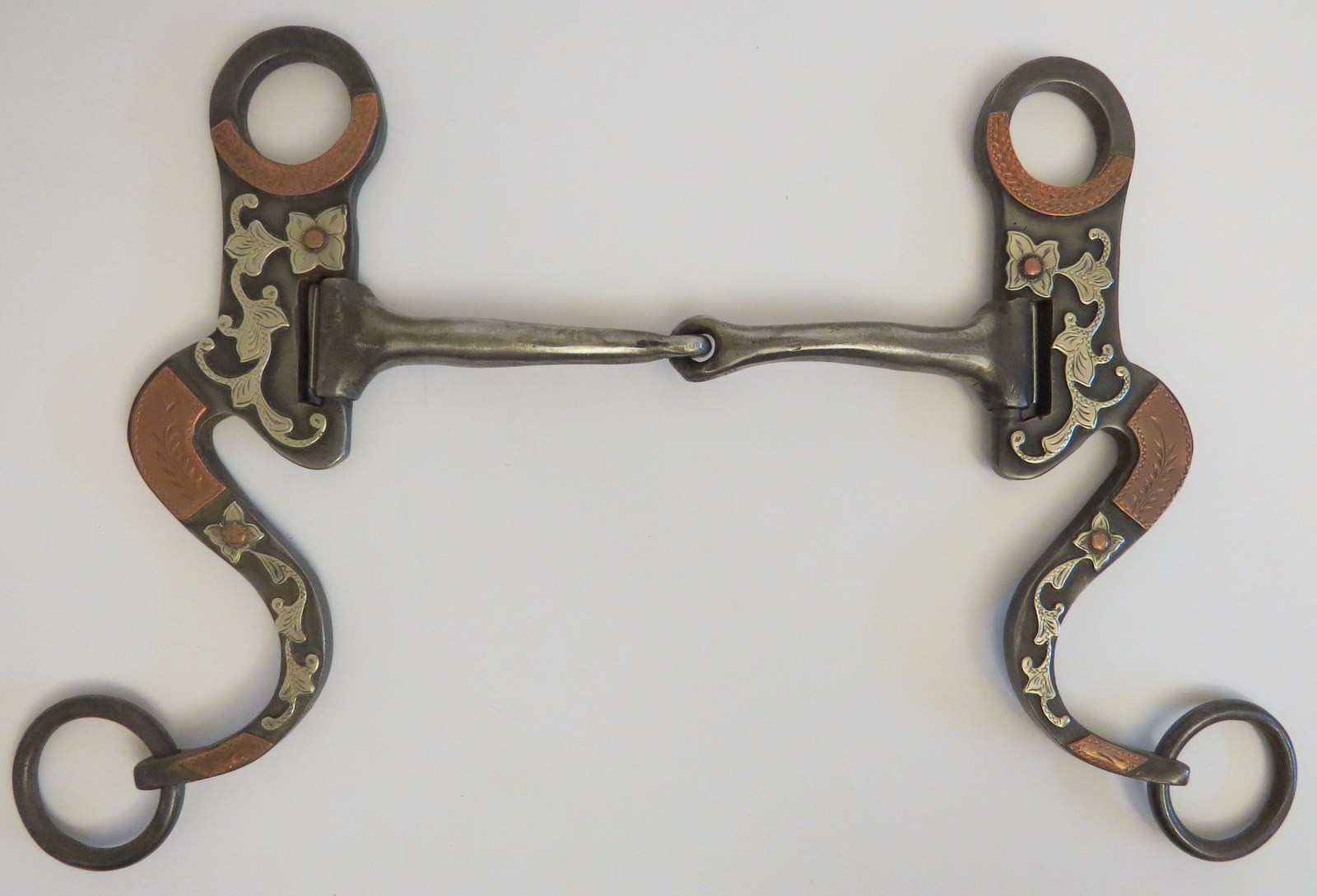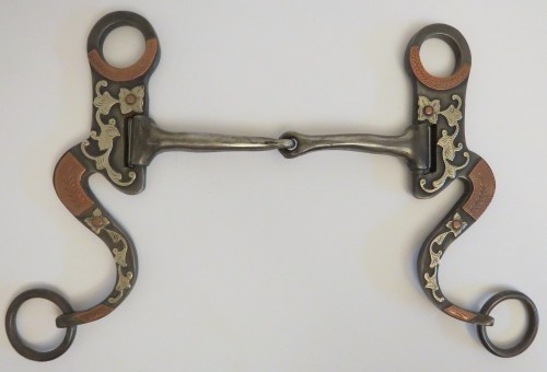 This is a new handmade snaffle bit with loose rein rings made by Larry Turner. Larry is a long time bit and spur maker from Stratford, Texas and is one of the spur makers invited to participate in the Texas Style Bit and Spur Makers Association Woman’s Protective Services auction along with other top makers. His work is sought after by cowboys and collectors alike. The bit is steel with a dark iron finish and is mounted with engraved nickel silver and copper. The mouth piece is steel and the back of the bars are inlaid with copper stripes. This would be a nice bit to use or to add to a collection.