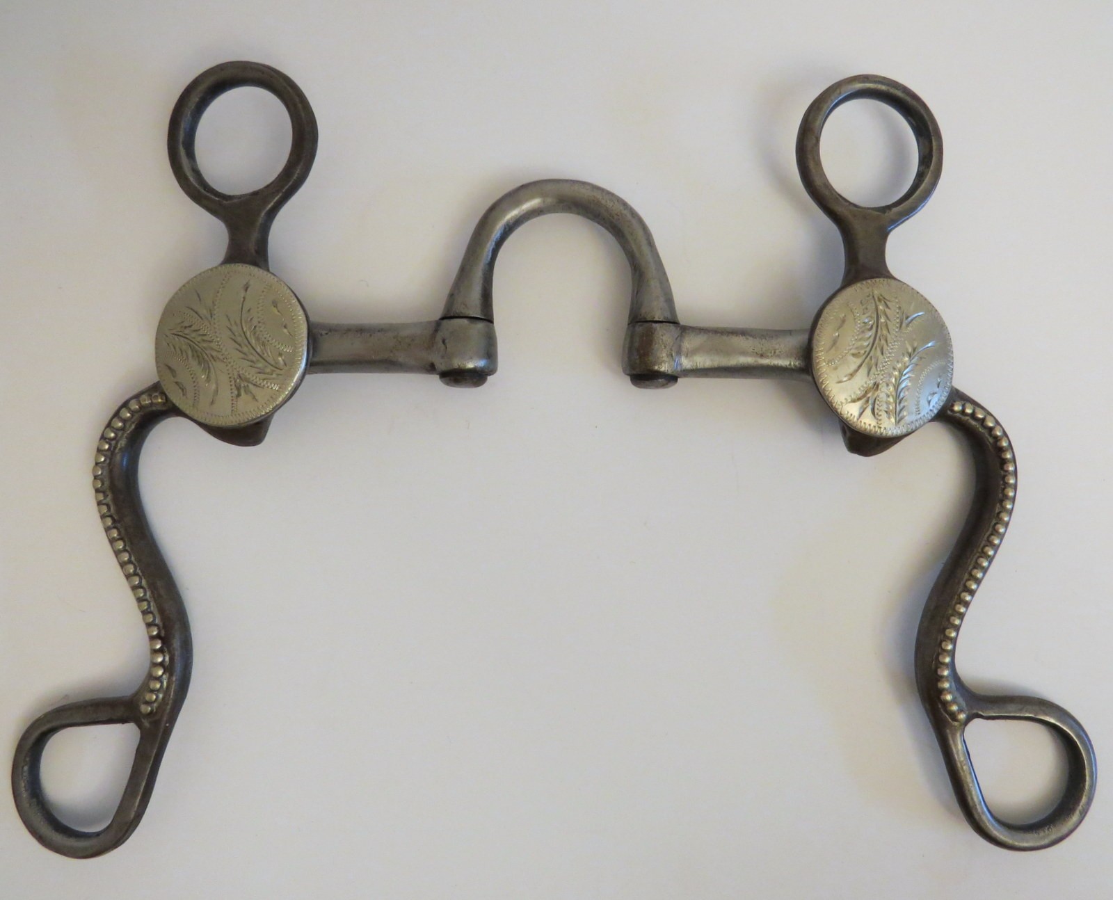 This is a like new handmade Pat Vaughn correction port bit. Pat is well-known bit and spur maker from Garden City, Kansas. It is marked with a P and an upside down V. Pat has been building bits and spurs since 1980 and is listed in Bits & Spurs, Motifs, Techniques, and Modern Makers by Ned and Jody Martin. It is steel and is mounted with engraved nickel silver. This would be a nice bit to add to a collection or to use.