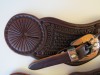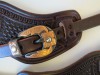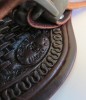 This is a new pair of handmade pass through style spur straps made by Rachel Scribner from Madill, Oklahoma. They are stamped with her maker stamp. Rachel does quality work. They are made of about ten to eleven ounce dark oiled skirting leather stamped with a basket weave pattern. The strap edges are beveled, hand rubbed, and dyed. The buckles were made by David Hunt. David is a long time bit and spur maker from Panhandle, Texas. They are marked HUNT and with his brand a joined 7H. They are steel mounted with copper flowers and leaves. The flowers have nickel silver centers. The buckles are attached to the straps with chicago screws. Rachel and David do a nice job and these would be a nice pair of straps to wear or to use to display with your collectible spurs. If you plan on wearing these please check the measurements below to see if they will fit your boot.
