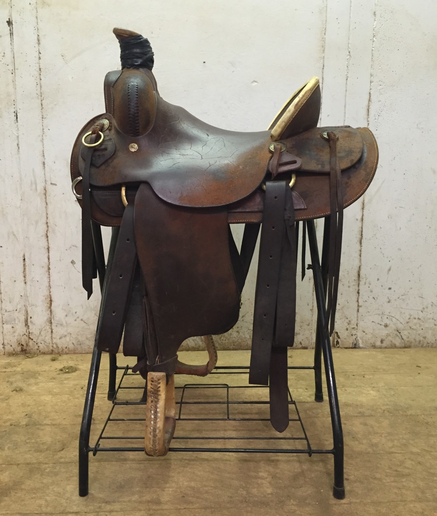 Solid using possible LouEllan 15 1/2 seat, 14 swell, 6 1/2 gullet, rawhide bound horn and cantle. Full roughout with brass hardware. Back cinch included, ships as pictured.