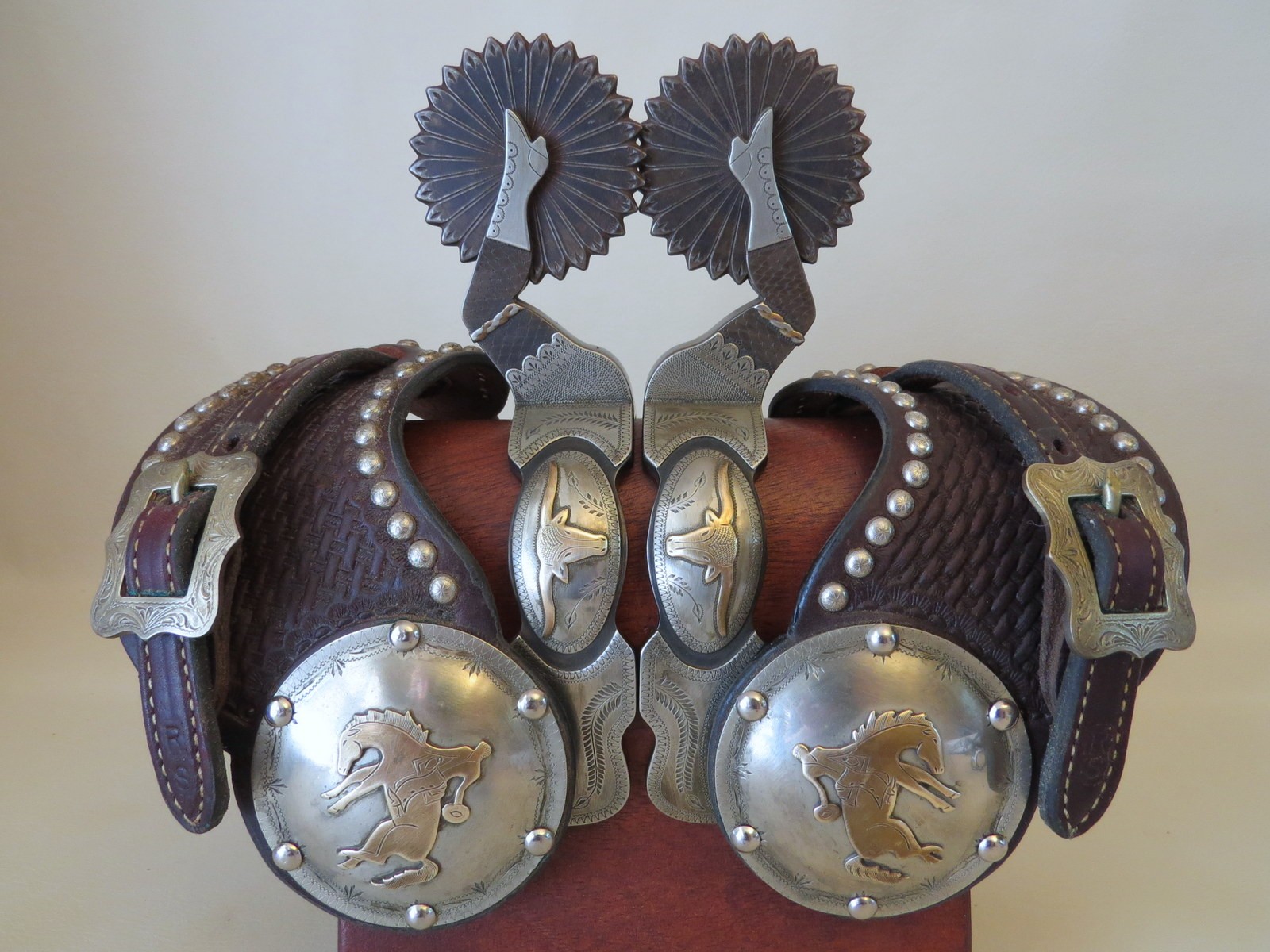 Handmade Bits & Spurs for Sale: 9726 New Handmade JERRY WALLACE Double Mounted Longhorn Gal Leg Spurs Straps, Conchos, Buckles SOLD #81865