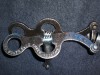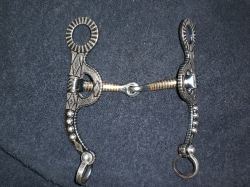 Les Vogt’s Flat Creek western bit, 5" snaffle mouth with copper inlay and 7" shank. Blued steel and engraved sterling silver inlay with stirrup bit ends. The Flat Creek bits were Vogt’s highest quality product, being made with the finest materials available. This bit has never been used and is in excellent condition with all bluing still present. $345 (Priority shipping included)