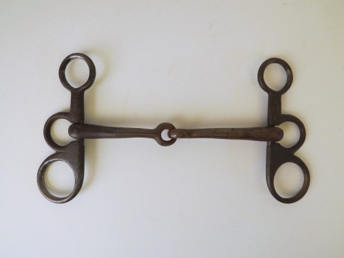 This is a used genuine Argentine snaffle bit marked Acero on one cheek piece and Argentina on the other cheek piece. These original bits are very hard to find. The bit is steel with a snaffle mouth. It is not bent, broken, or repaired. This bit has been used and shows wear at the hinges and center rings. Wear is shown in close up pictures. It still has a lot of use left in it. This would be a nice bit to use or to add to a collection.
