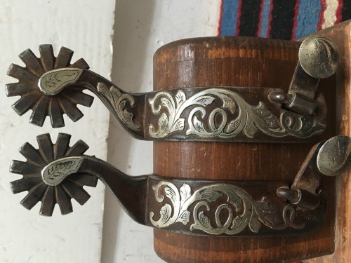 Handmade spurs by David Farkas and marked FARKAS 175. Good used condition with rowels pins that are good. He has to do a lot of cut out work to prepare the silver to mount on this pair. 1 1/8" bands, 3 1/4" heel openings, 1 3/4" rowels, and 2 1/4" shanks.