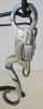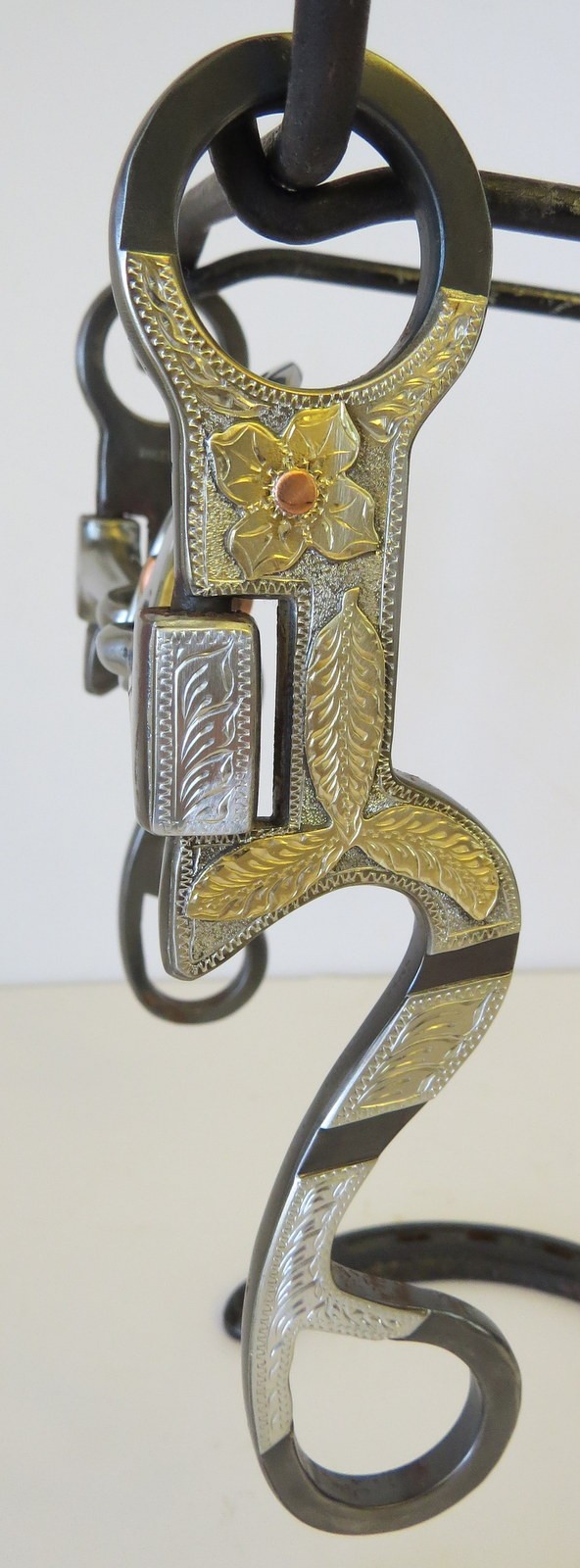 This is a new handmade floating spoon bit made by long time bit and spur maker Don Rogers from Hereford, Texas. Don has been building since 1975 and his work is sought after by cowboys and collectors alike. Don is listed in Bits and Spurs, Motifs, Techniques and Modern Makers by Ned and Jody Martin. The bit is marked Rogers inside the cheek piece. The bit is steel and the cheek pieces are overlaid with eight pieces of nickel silver. The nickel silver is mounted with brass flowers and leaves with a copper dot in the center of the flowers. This would be a nice to use or to add to a collection.