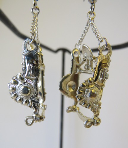 Measurements: Length from center of wire to bottom of bit 2 ¼”, Bit Dimensions approximately 1 ¼” long by ¾” wide, Weight of both earrings .3 ounce weighed on a postal scale