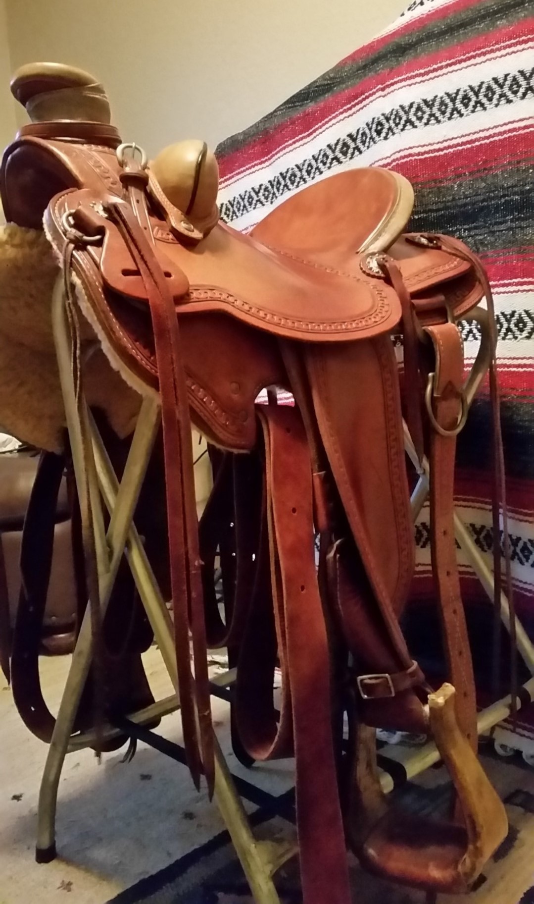 Well maintained saddle, always stored inside,no mold or dry rot, 14.5 seat, includes matching rear cinch, call with questions.