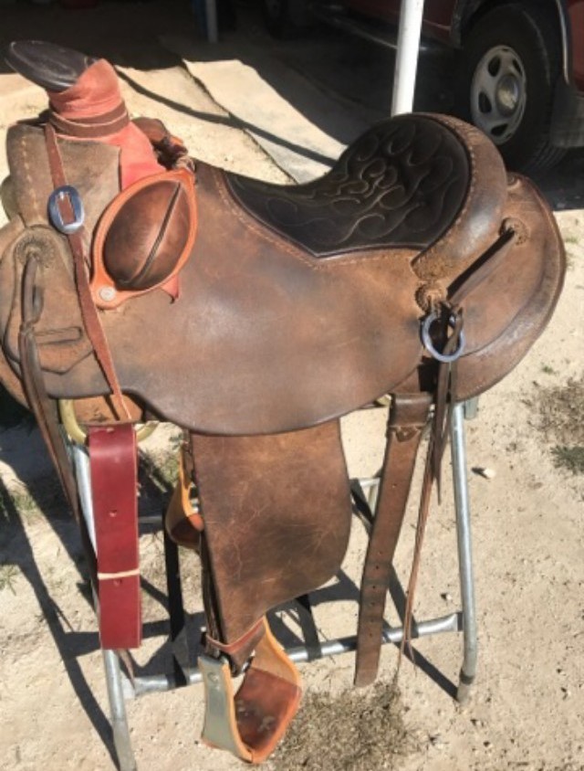 RAY HOLES GRANGEVILLE, IDA. marked saddle in good used conition, good lining, solid tree. Probably a 14.5" tree, but will ride a little smaller. Hard to find saddle by one of the legends of saddle making. We accept most forms of payment. We will pay shipping within the 48 states. Will consider trades of hand made bits and spurs.