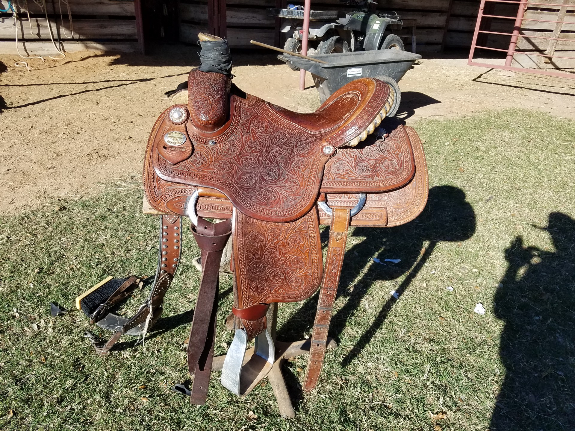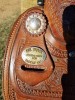 Fully tooled, ostrich seat inlay, FQH bars, 7.5" wide gullet, great condition. Fleece is in excellent condition