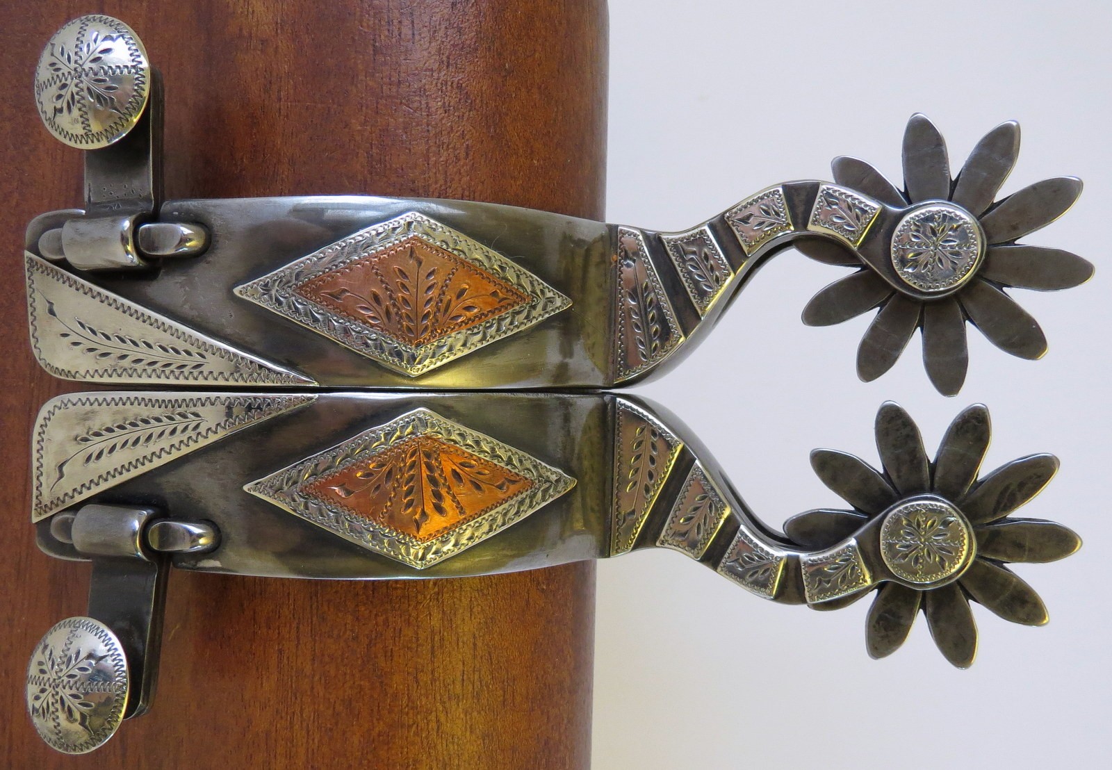 This is a new pair of handmade double mounted spurs made by Bartlesville, Oklahoma bit and spur maker Mike Emberson. The spurs are marked Emberson 2017 on the outside of the heel bands under the offside hanger. Mike is one of the select spur makers that provide spurs to the Women’s Protective Services annual auction. Mike does really nice work. The spurs are steel and are mounted with twenty two pieces of nickel silver and two piece of copper. These spurs would make a great pair of using spurs or a nice pair to add to a collection.