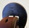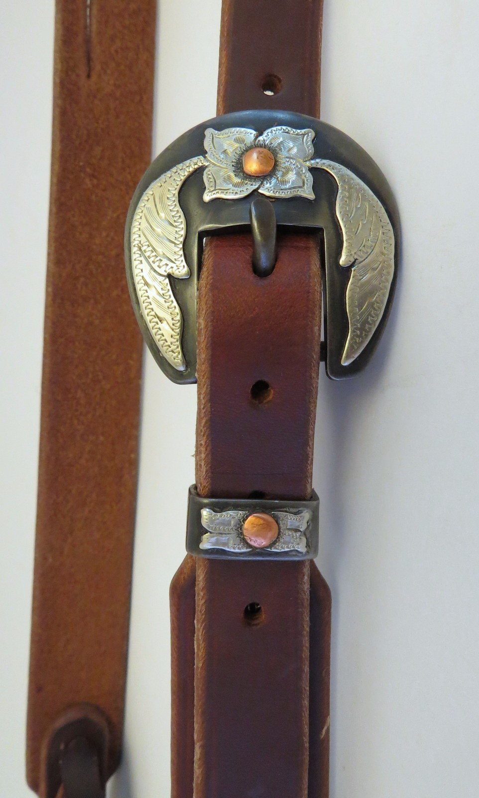 This is a nice handmade harness leather headstall made by Ron Carlton with a handmade buckle made by David Hunt. Ron is from Canyon, Texas and it is maker marked with his stamp. Ron started building in 1987 and worked for Bob Marrs. He is listed in Old Cowboy Saddles & Spurs by Gretchen & Mike Graham. The headstall is made out of Herman Oak harness leather and is nice and supple. The edges are beveled and hand rubbed. The buckle was made by David Hunt from Panhandle, Texas. The back of the buckle is marked Hunt and with his brand 7H. It is steel mounted with nickel flowers with copper centers and nickel silver leaves. It is attached to the headstall with a chicago screw. This would be a very nice headstall to use.