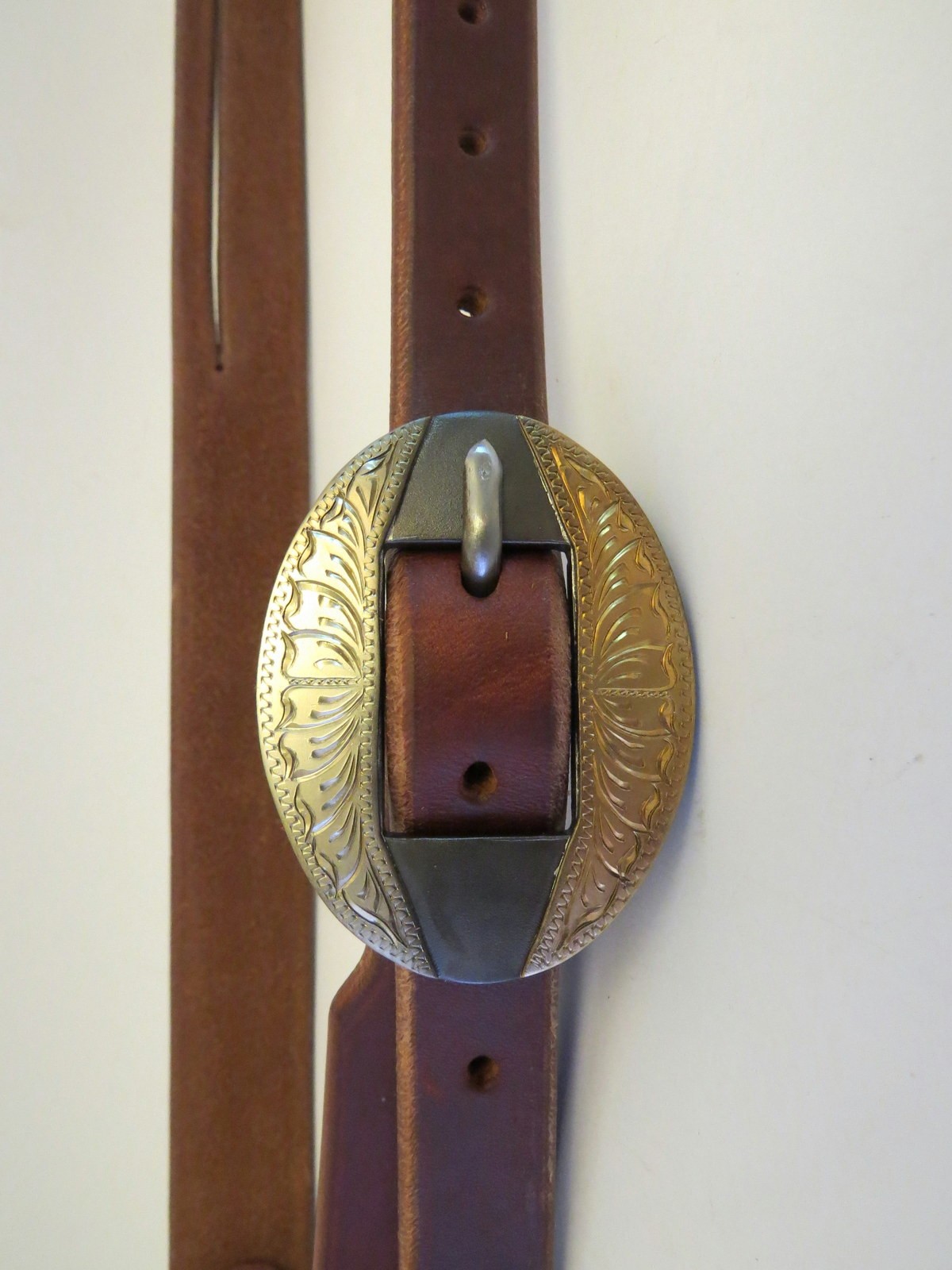 This is a nice handmade harness leather split ear headstall made by Ron Carlton with a handmade buckle made by Don Rogers. Ron is from Canyon, Texas and it is maker marked with his stamp. Ron started building in 1987 and worked for Bob Marrs. He is listed in Old Cowboy Saddles & Spurs by Gretchen & Mike Graham. The headstall is made out of Herman Oak harness leather and is nice and supple. The edges are beveled and hand rubbed. The buckle was made by Don Rogers from Hereford, Texas. The back of the buckle is marked Rogers. It is steel mounted with engraved brass on one side and engraved nickel silver on the other side. It is attached to the headstall with a chicago screw. This would be a very nice headstall to use.
