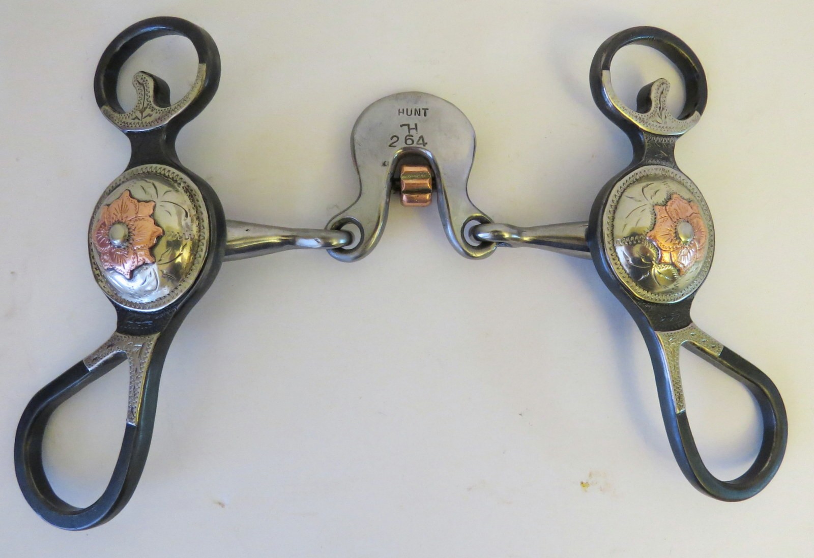 This is a new handmade floating spoon or spade bit made by David Hunt of Panhandle, Texas. It is marked Hunt and his brand and the number 264 on the spoon. David is a well-known bit and spur maker and has been building for over a decade. David is among the select group of spur makers to provide spurs for the Texas Style Bit and Spur Makers Association Woman’s Protective Services auction along with other top makers. The bit is steel and is mounted with an engraved nickel silver concho with a copper flower and a nickel silver dot in the center of the flower. There is engraving in the steel between the mountings. The spoon has a copper roller. This would be a nice bit to use.