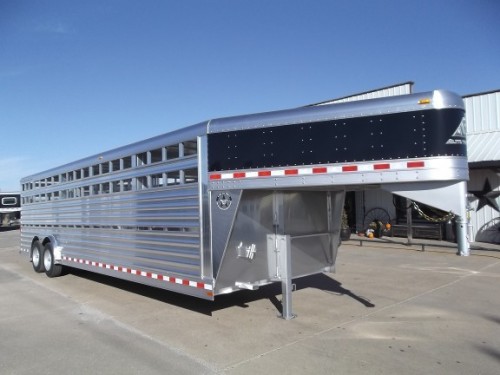 8 x 28 x 6.5 Tall. 2018 Elite V-Nose GN Stock Trailer. 50’’ Escape Gate, Two Cut Gates (Back Gate w/ Slider), Full Swing Rear Door w/ Slider, 8K Axles, 17.5 Tires, Extra Low Air Space, Corrugated Floor, Black Skin...