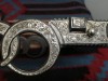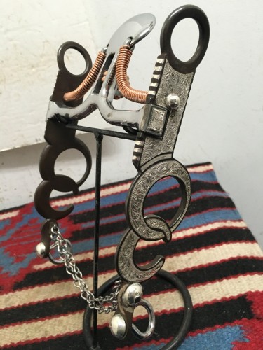 Beautiful bit marked Charlie’s in unused condition, with very nice engraving, unique design, 5 1/8" mouth, 7 5/8" cheeks, lip chains, 3 3/4" high spoon spade, weighing approximately 1lb. 7oz. The insides of the cheeks are very smooth with some rounding of the edges. This bit was hand made by long time silver and steel artisians in Mexico for CHARLIE’S. This bit was made to use, but will adore most collections. We pay shipping within the 48 states and accept most forms of payment.