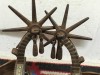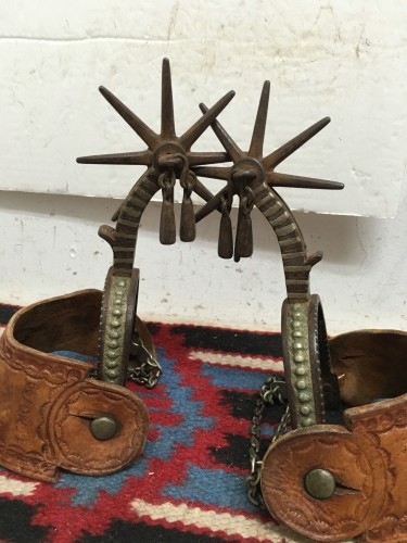 Early pair of spurs in very good condition. The heel chains are not original, but otherwise good. In as found condition, have not polished. Straps are pliable and usable and stamped 13/10/99. Really fit the spurs, but not near as old. Large jingle-bobs, 4" rowels, 3 1/2" heel openings, 3 1/2" shanks. Nice addition to many collections. We pay shipping within the 48 states. We accept most credit cards, Pay Pal, money order, or check.