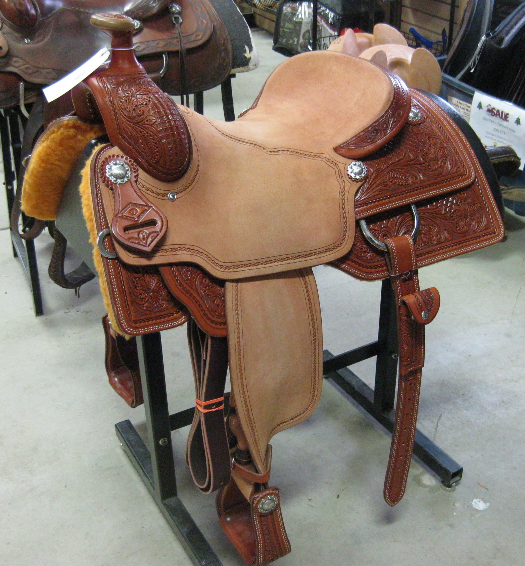Beautiful brand new Diamond D Saddlery ranch cutting saddle. It has a rough out hard seat, jockeys, and fenders. The tooling is elegant and it comes with a rear cinch.