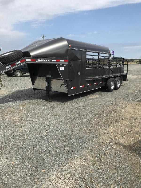 New 2018 Delco Premium Catch Trailer, 2-7k torsion axles, small tack room with diamond plate floor, 4 saddle racks, LED dome light, rubber floor, 8 ft open, gray paint.