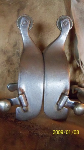 1950’s pair of Ed Blanchard No. 2 stainless steel, Yucca - Ariz spurs. These are in good using condition. The bands are 1-1/4" wide and the heel openings are 3-1/4".
