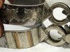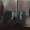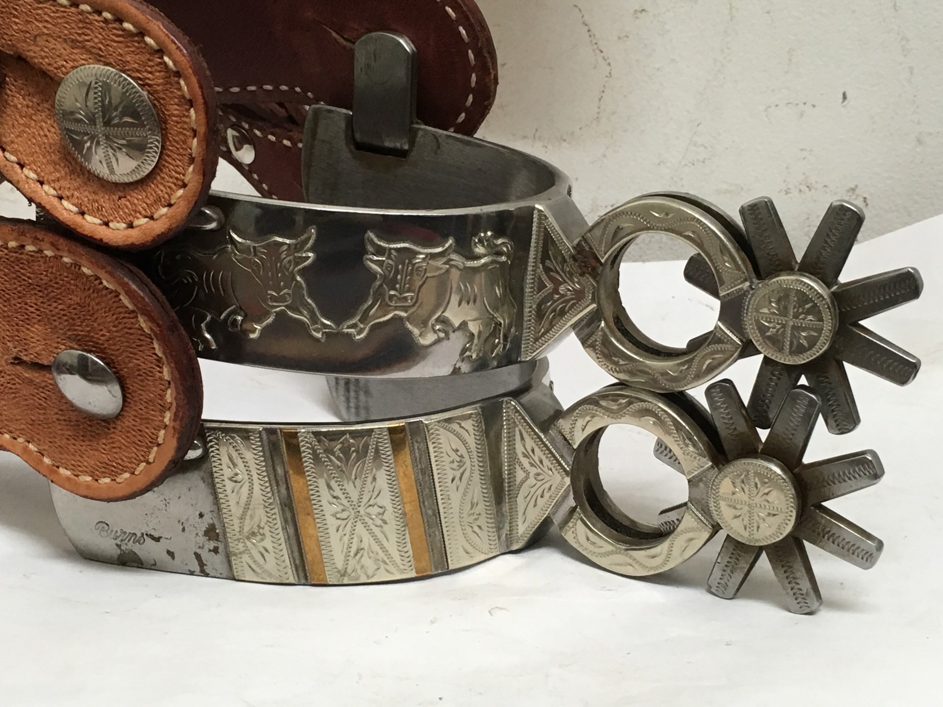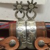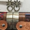 Hardly ever does one seel a pair of Burns Chihuahua style spurs, especially for sale and in unworn condition. This pair has good leathers, his fine detailed work, engraved 1 1/2" rowels, 3 1/2" heel openings that can be closed a little, 2 5/16" shanks, 1 1/4" bands. Much cut out silver work on this pair. Just a little rust has started. We pay shipping within the 48 states and accept most forms of payment.