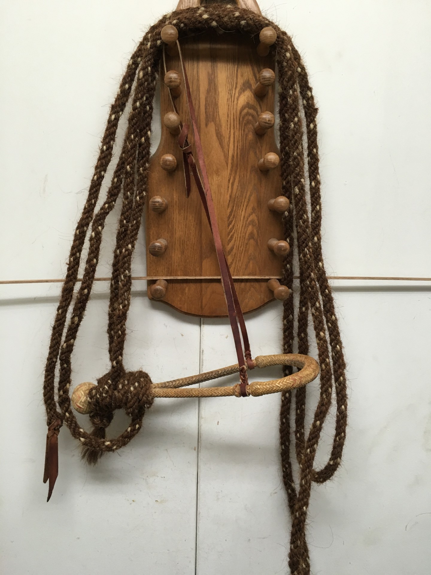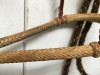 Lightly used hackamore with 1/2" rawhide bosal of nice quality. Looks domectic braided, but not sure. I am calling the mecate 9/16" Nothing fancy, but a good using/traning hackamore. We pay shipping within the 48 states and accept most forms of payment.