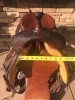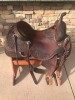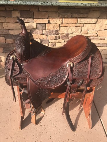 Nice saddle. Broken in but well cared for. Complete with back cinch. 8” swell. 4” horn. 28” skirt. Beautiful oak leaf tooling. Wooden nettles stirrups. Was originally sold as a 16” seat but measures 16 1/2. Buyer to pay shipping