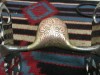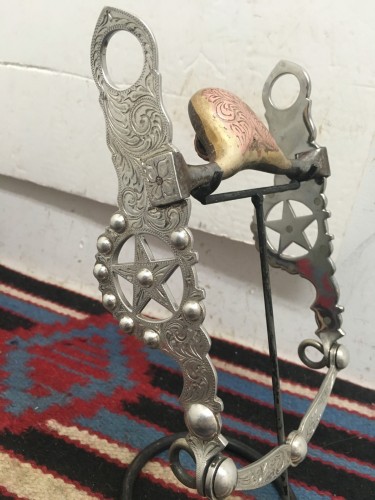 Very good condition on this Capriolla Garcia bit that is marked GARCIA 13160 ELKO, NEV. Engraved copper cover over the copper crickett, sterling overlaid hand engraved 7 1/4" cheeks, and 5 1/8" sweet iron mouth. Good bit to use of add to a collection. We pay shipping within the 48 states. We accept most credit cards, Pay Pal, money order, or check.